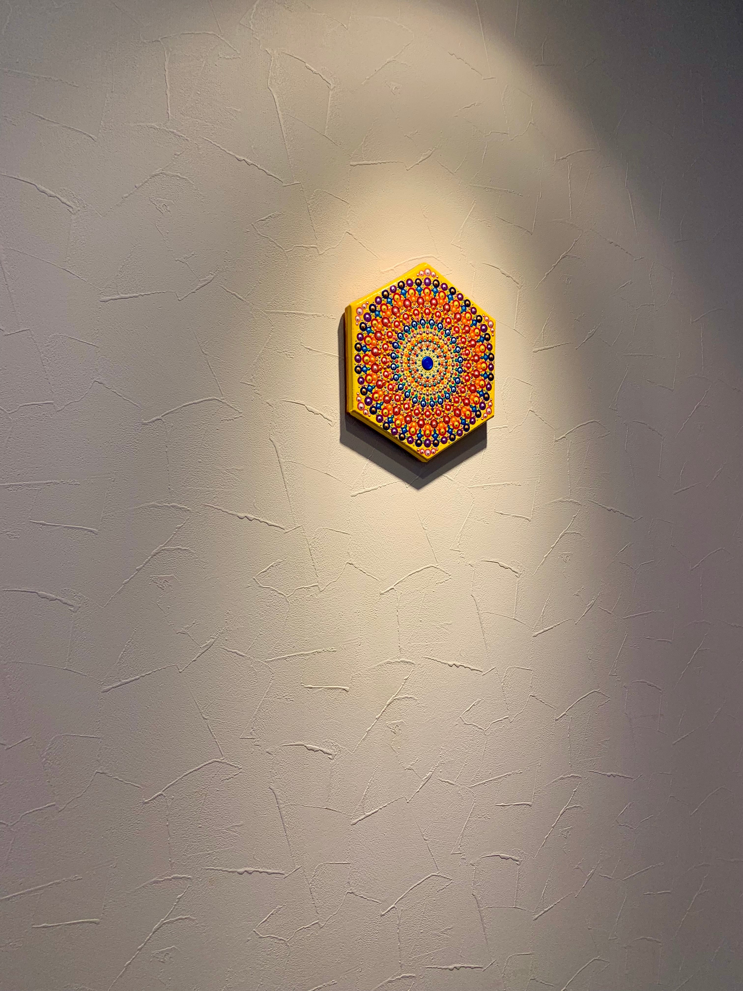 (木枠に張りキャンバス、アクリル絵の具、全体を光沢ニスでコーティングしてあります。ピンひとつで壁に掛けることが可能です。)
