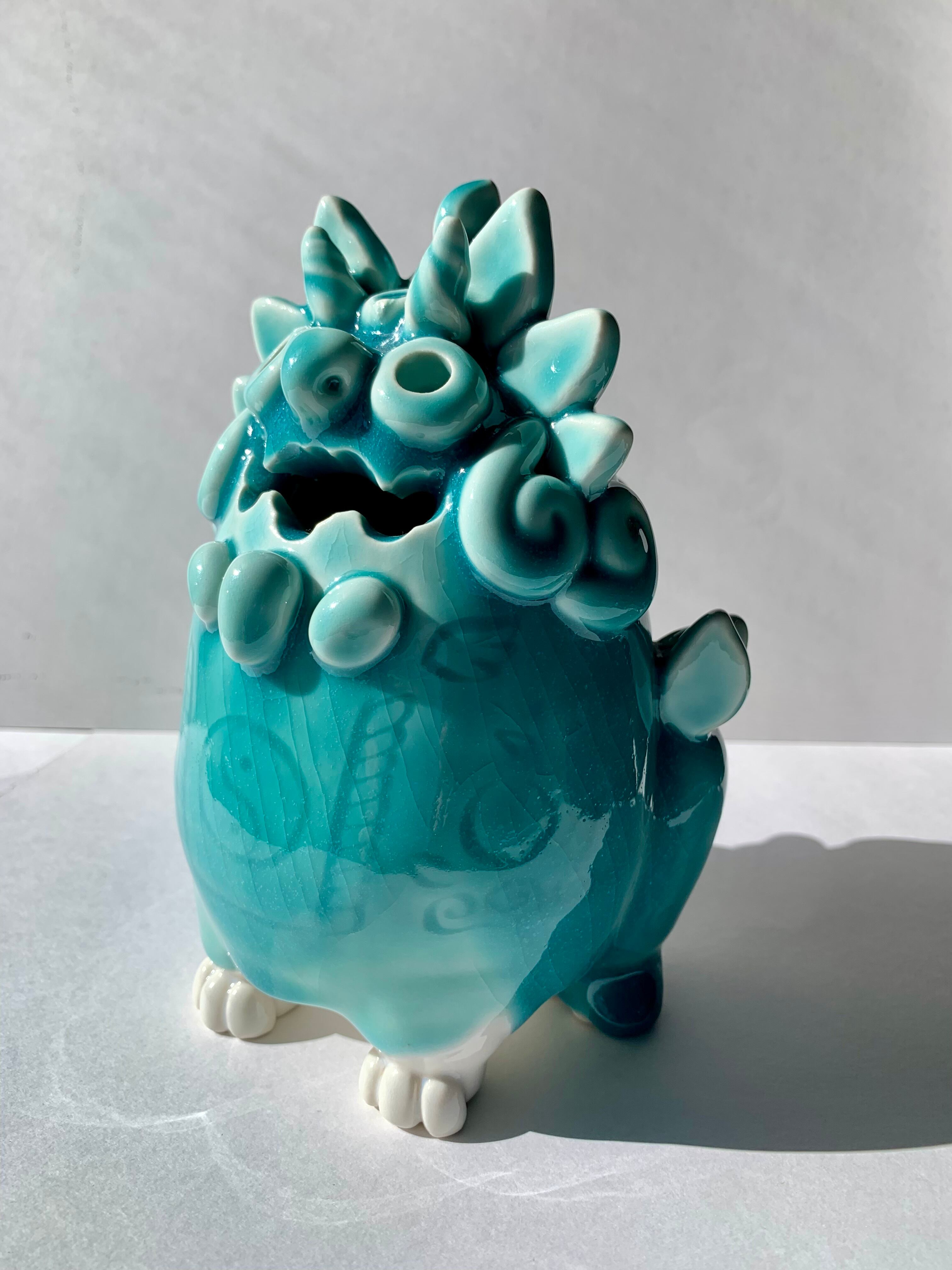 四つ足も、お腹の模様もすべて手作りの焼きものです。